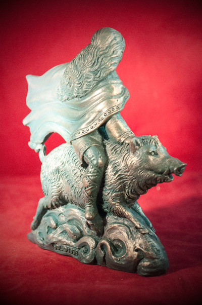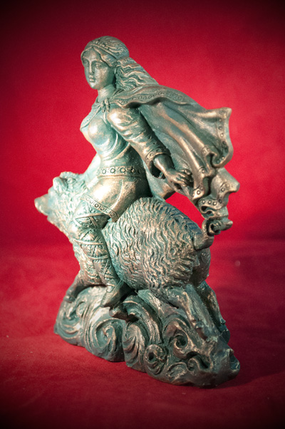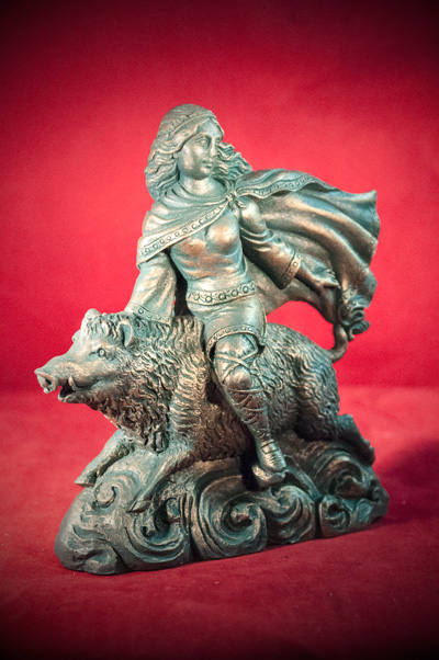 This Norse Goddess sometimes rode upon the boar, Hildisvini, probably a metaphorical image of sacred sexuality designed to bring crop fertility. [19th century art image] 5 1/4"" gypsumstone statue, blue verdigris color finish.