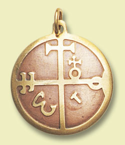 Copied from a design on a Knight's Magic Belt, this amulet is worn to bring about a Speedier Achievement of the wearer's Desires and Goals. Made of brass and copper. Approximate size: 1Ó in diameter.