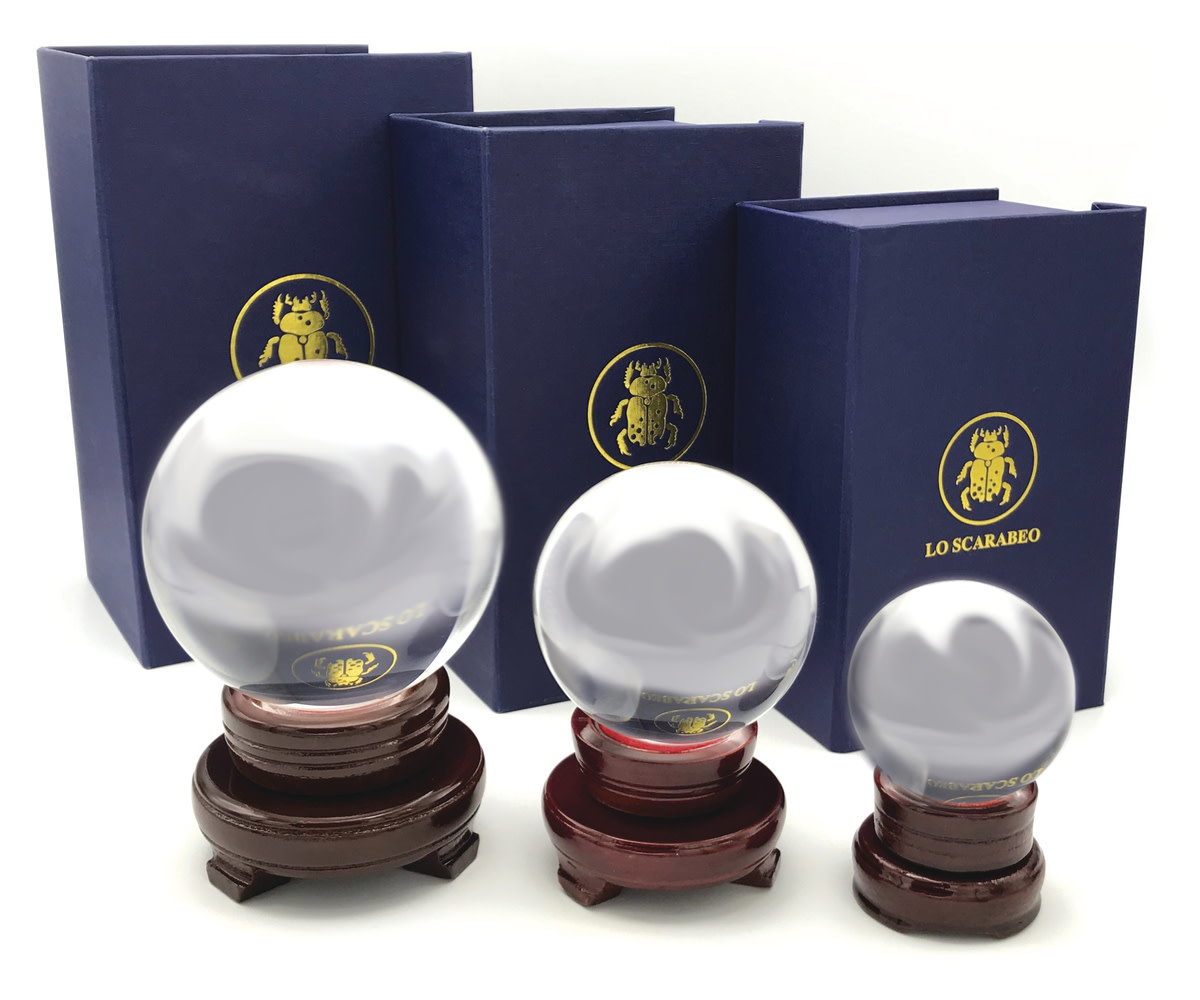 Explore the world of magical divination with an elegant glass sphere. Packaged with a handsome wooden support in a deluxe box, the sphere is available in three sizes. Includes one glass sphere, one wooden support, an instruction booklet, and a deluxe box.